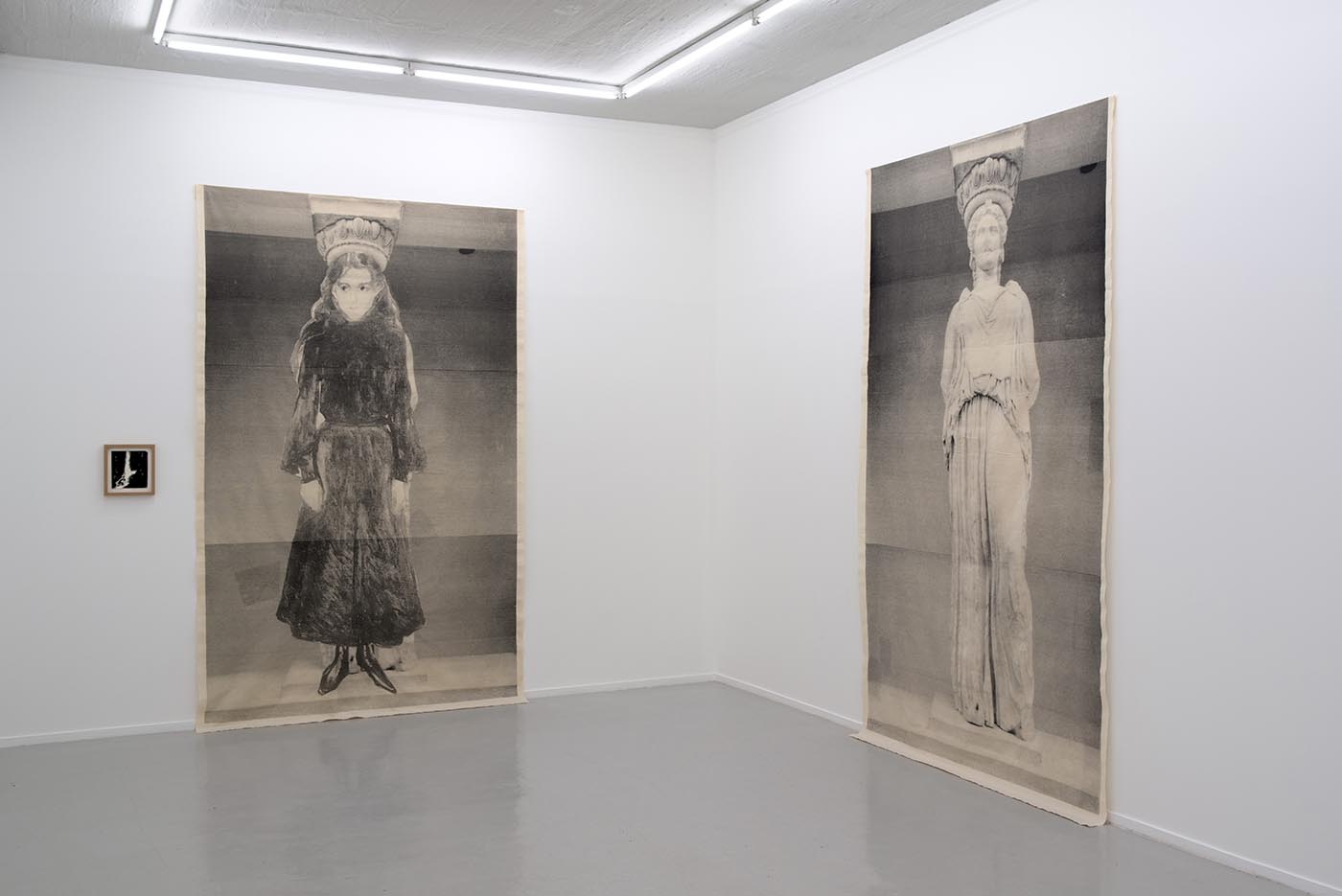 The three young girls from modern times have the same frontal, free-standing pose as the pillar figure from the Acropolis. Standing in her place, they are given a kind of task. They too are suddenly classical. With hats and aprons, they become solid stanchions of support. They belong to art history, but are also nature and human, which makes the weight they bear recognizable.