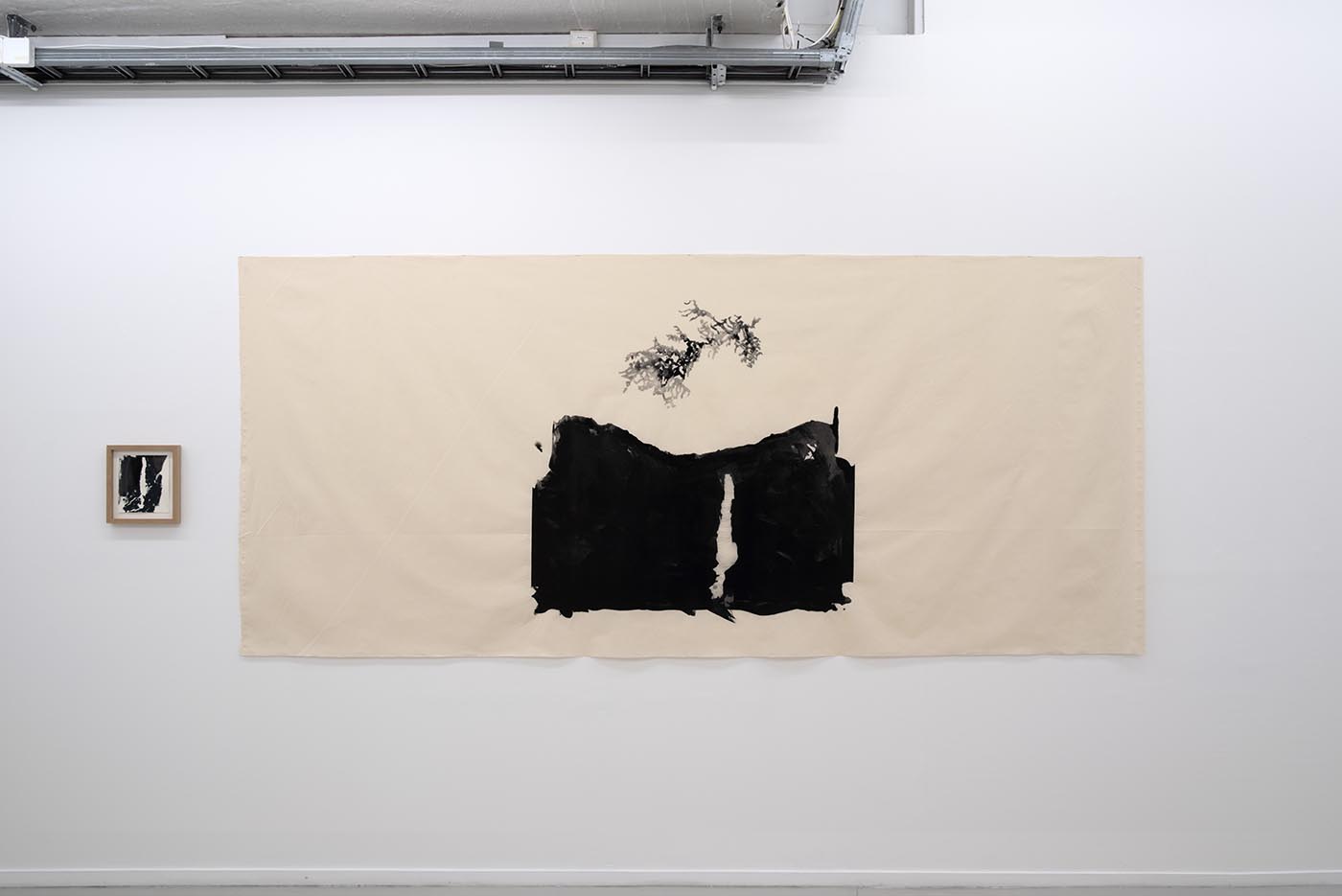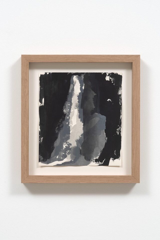 Pillar figures, which stretch from floor to ceiling, and the sharply defined contour of a white waterfall against a black mountainside.